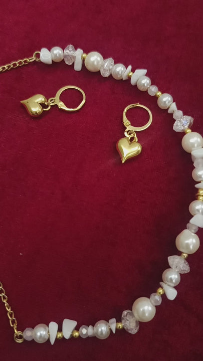 The Golden Heart Pearl Charm Set is designed to bring a soft romantic glow to your look. The necklace features a beautiful mix of lustrous pearls, natural chip beads, and shimmering crystals, finished with a dainty golden heart charm at the center.
